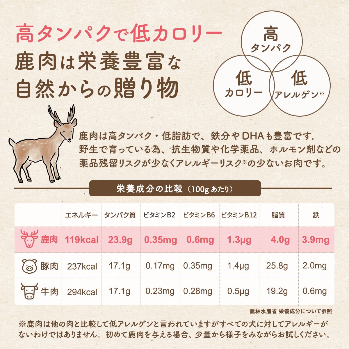 鹿は自然の中に生息し野草等で育ちます、飼料等で飼育された家畜のお肉と比較して低アレルゲンと言われています。また過酷な自然の中で生きる鹿のお肉は脂肪も少なく高タンパク、低カロリーな赤身のお肉です。