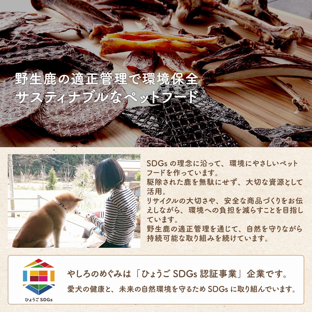 やしろのめぐみの鹿肉はペット用(主に犬用)の鹿肉専門の施設です。精肉(人用)と兼用の施設と違い、鹿の良質な赤身をふんだんに使った贅沢な鹿肉です。