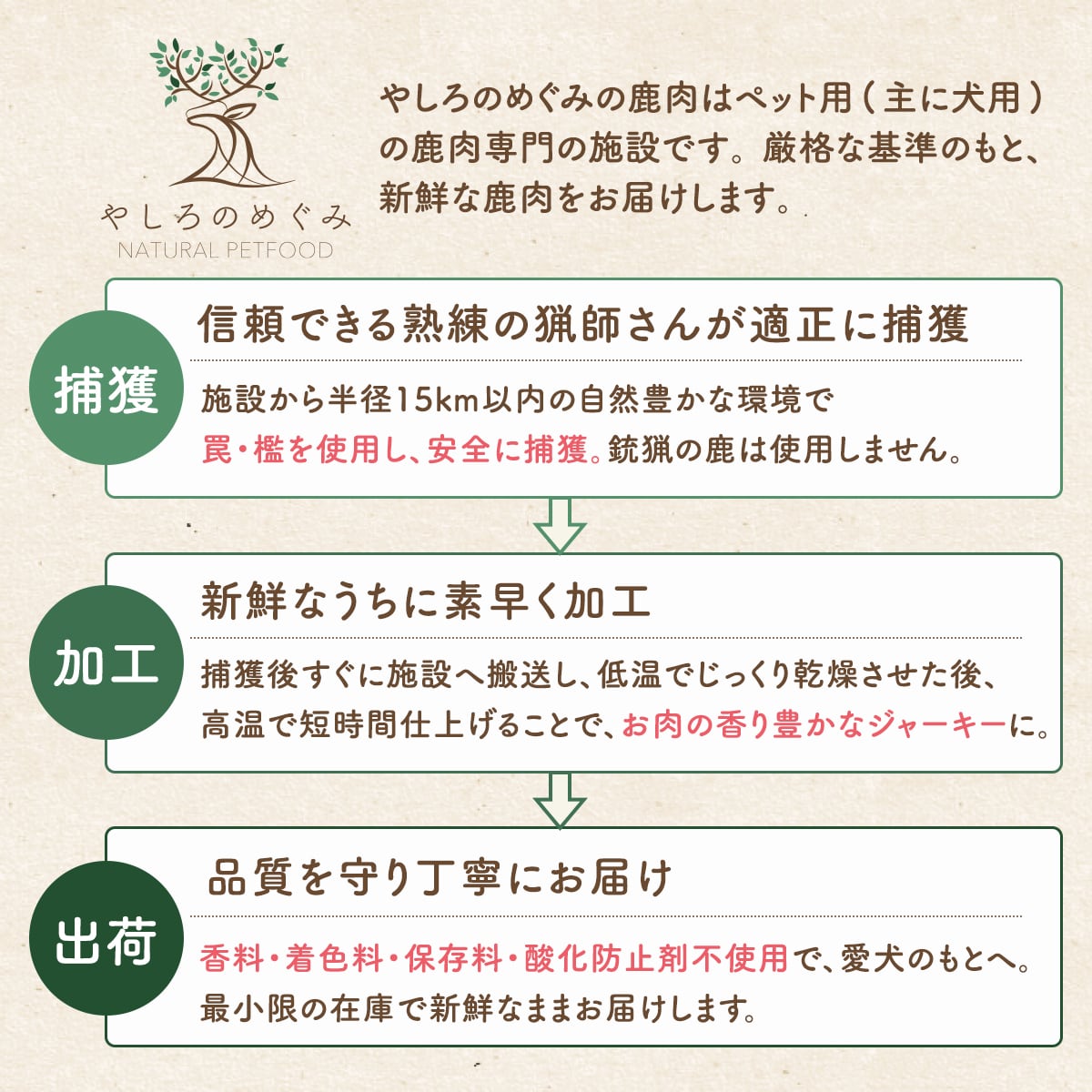 -やしろのめぐみのジャーキー兵庫県の但馬地域にある鹿肉加工施設で捕獲から販売まで安全で衛生的に管理したヒューマングレードの犬用鹿肉ジャーキーです-